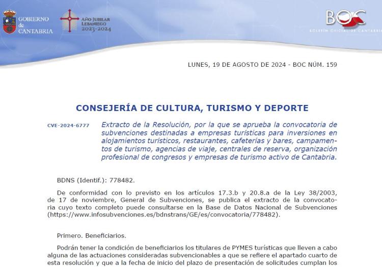 Extracto de la Resolución, por la que se aprueba la convocatoria de subvenciones destinadas a empresas turísticas para inversiones en alojamientos turísticos, restaurantes, cafeterías y bares, campamentos de turismo, agencias de viaje... Noticias Lee más sobre Extracto de la Resolución, por la que se aprueba la convocatoria de subvenciones destinadas a empresas turísticas para inversiones en alojamientos turísticos, restaurantes, cafeterías y bares, campamentos de turismo, agencias de viaje...